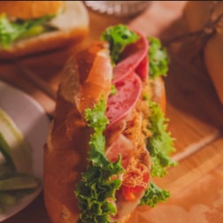 Pain frais, fait maison. Crudités, cheddar, cordon bleu & steak.